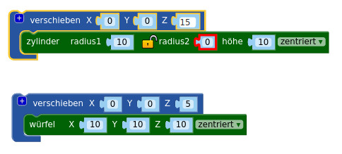 > So wird bspw. ein quaderförmiges Objekt durch die Parameter Länge, Breite und Höhe und ein Zylinder durch seinen Radius und seine Höhe definiert. Durch Anpassung dieser Parameter lassen sich aus wenigen Grundkörpern (Kugeln, Quader(Würfel), Zylinder und Ringen) alle erdenklichen Körper formen.
